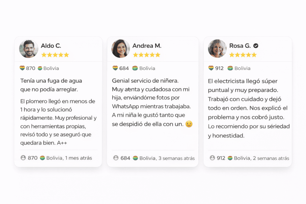 Las reseñas sirven para construir confianza y ayudarte a conseguir más clientes con el tiempo. A medida que atiendas servicios, los clientes podrán calificarte y dejar comentarios. Además, podremos marcar perfiles como verificados cuando completen el proceso de validación (según criterios definidos).
